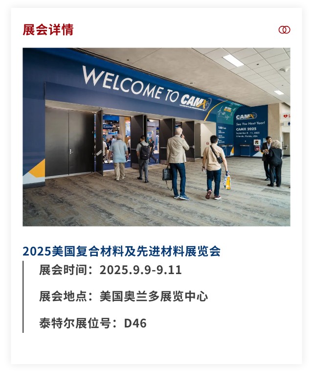 2025美國復合材料及先進材料展覽會 (CAMX 2025),將于9月9日至11日在美國奧蘭多展覽中心盛大舉行。泰特爾誠邀全球合作伙伴蒞臨展位,共探復合材料市場的創(chuàng)新與機遇!