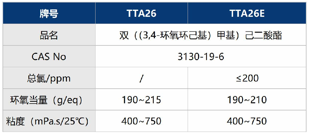 光固化3D打印成型材料為液體光敏樹脂,主要由預(yù)聚物樹脂、稀釋單體、光引發(fā)劑、助劑等組成。脂環(huán)族環(huán)氧樹脂因?yàn)榫哂械驼扯取Ⅲw積收縮率低、陽離子固化速度快的特點(diǎn),被廣泛用于SLA型3D打印光敏樹脂中,代表性脂環(huán)族環(huán)氧樹脂為TTA21。韌性是3D打印材料評(píng)估中重要的指標(biāo)之一,為了進(jìn)一步改善3D打印材料的韌性,可選擇柔韌性的脂環(huán)族環(huán)氧樹脂,如TTA26,主要指標(biāo)如下: